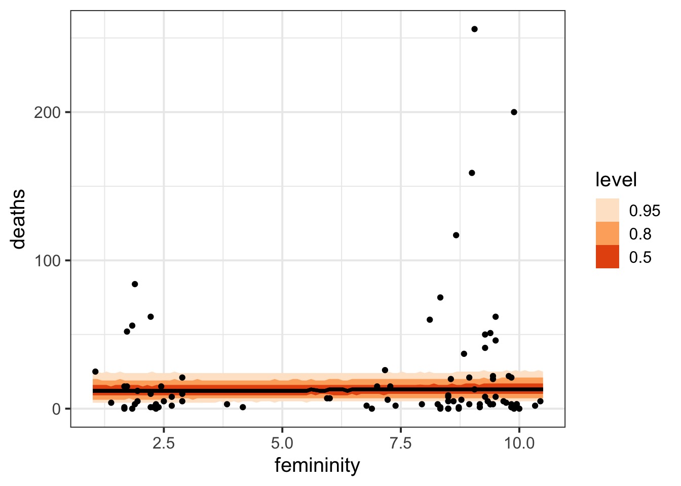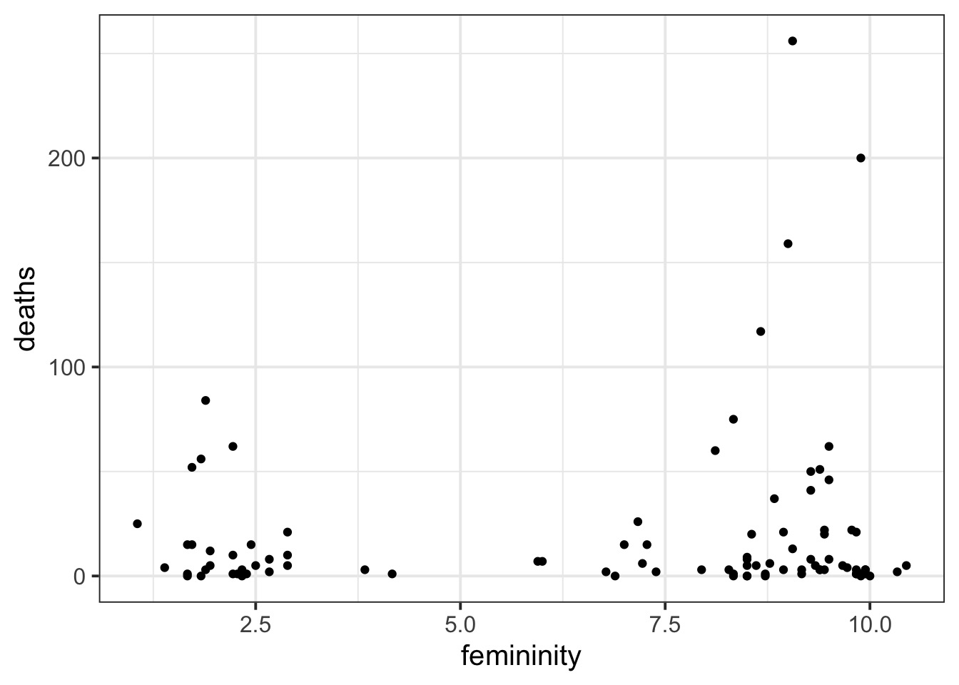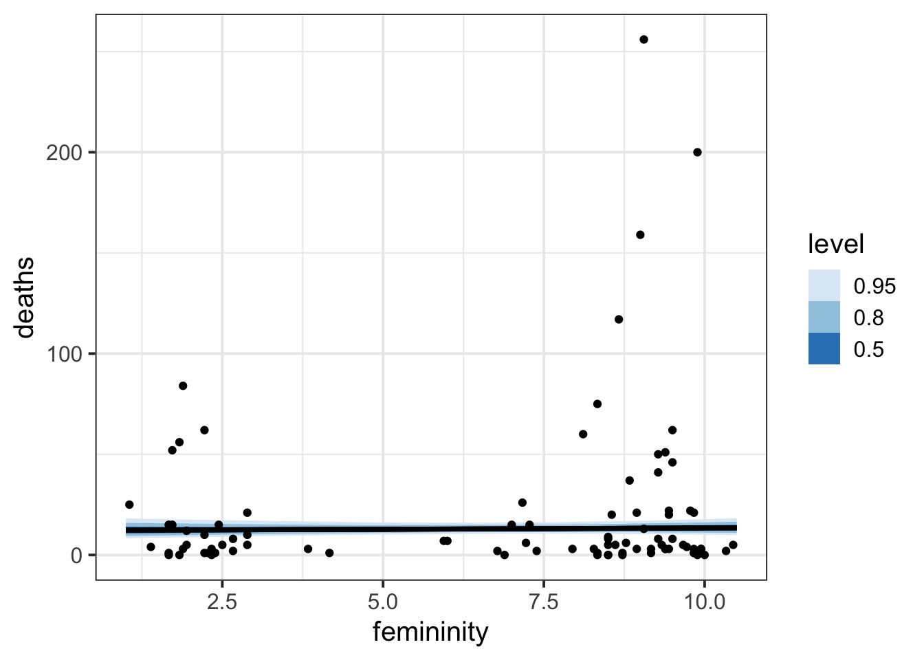 glm(formula = deaths ~ femininity, family = quasipoisson, data = Hurricanes)
